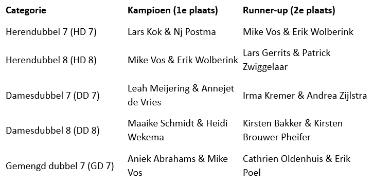 Namens Sjoerd, Marianne, Marije, Irma en Andrea willen we iedereen hartelijk bedanken voor de geweldige inzet en gezelligheid tijdens deze kampioenschappen. Zonder jullie enthousiasme — als speler, vrijwilliger of toeschouwer — zou dit toernooi niet zo geslaagd zijn geweest.
