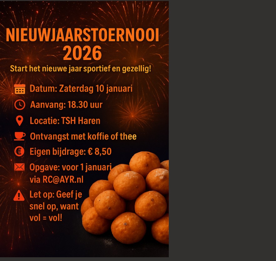Zaterdag 10 januari vindt ons altijd gezellige nieuwjaarstoernooi in Haren plaats.